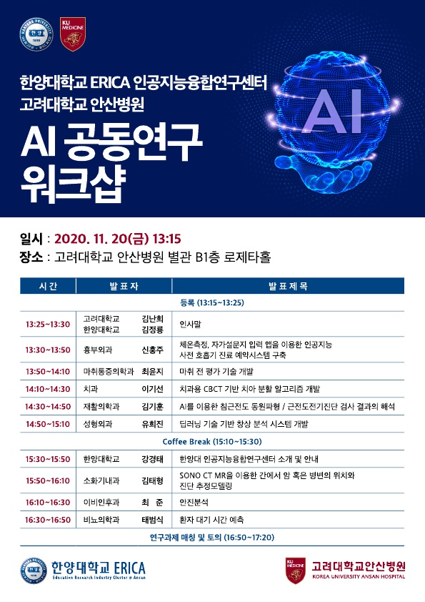 | Á¦¸ñ | [20.11.20(±Ý)] ÀΰøÁö´ÉÀ¶ÇÕ¿¬±¸¼¾ÅÍ AI °øµ¿¿¬±¸ ¿öÅ©¼¥, °í·Á´ë¾È»êº´¿ø º°°ü |